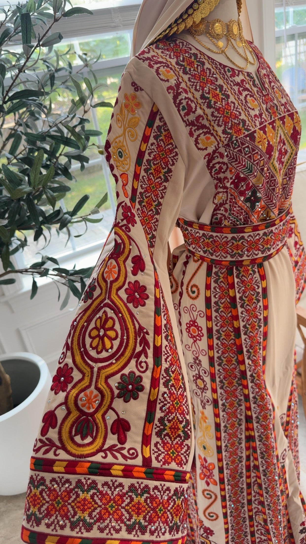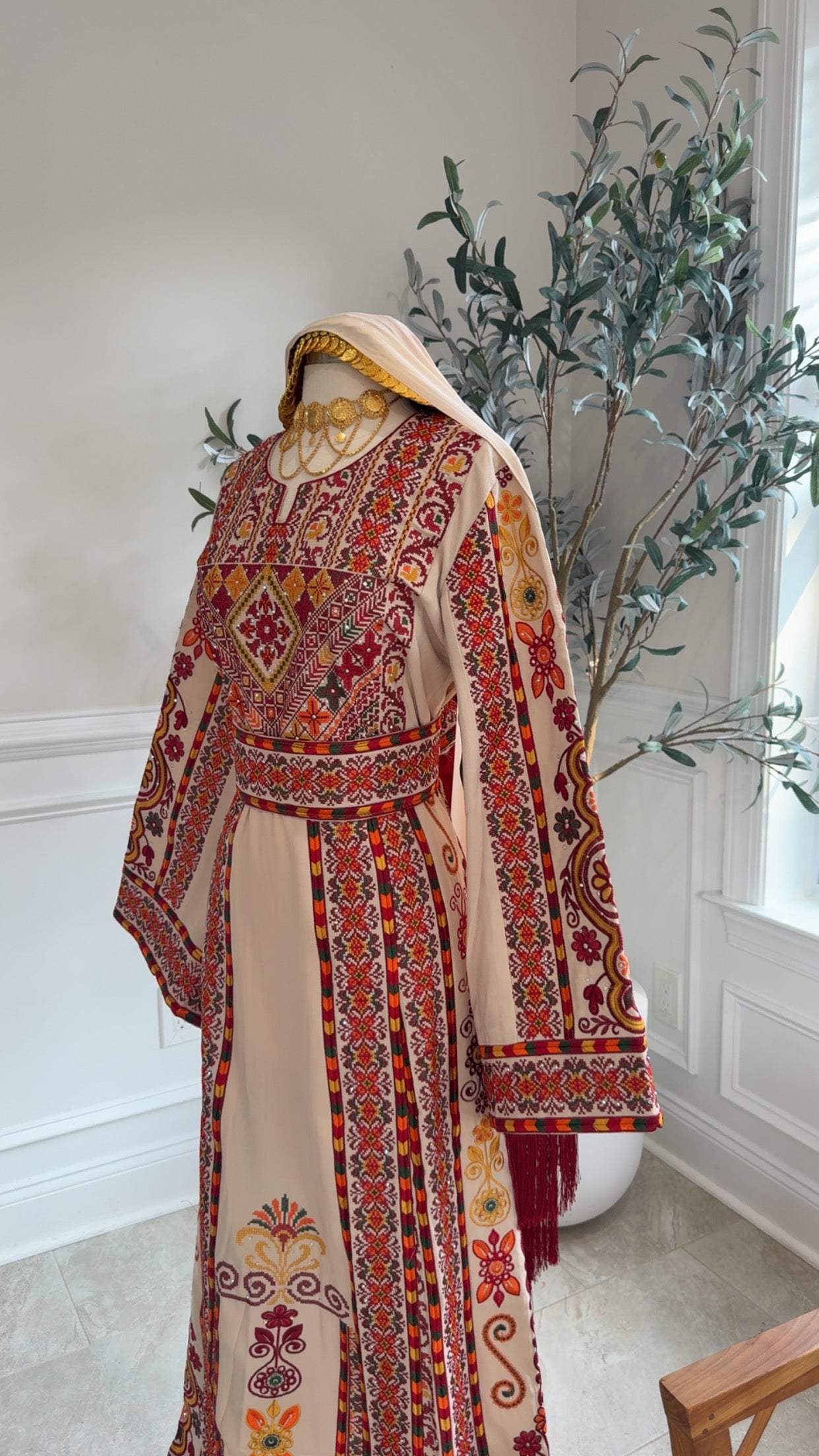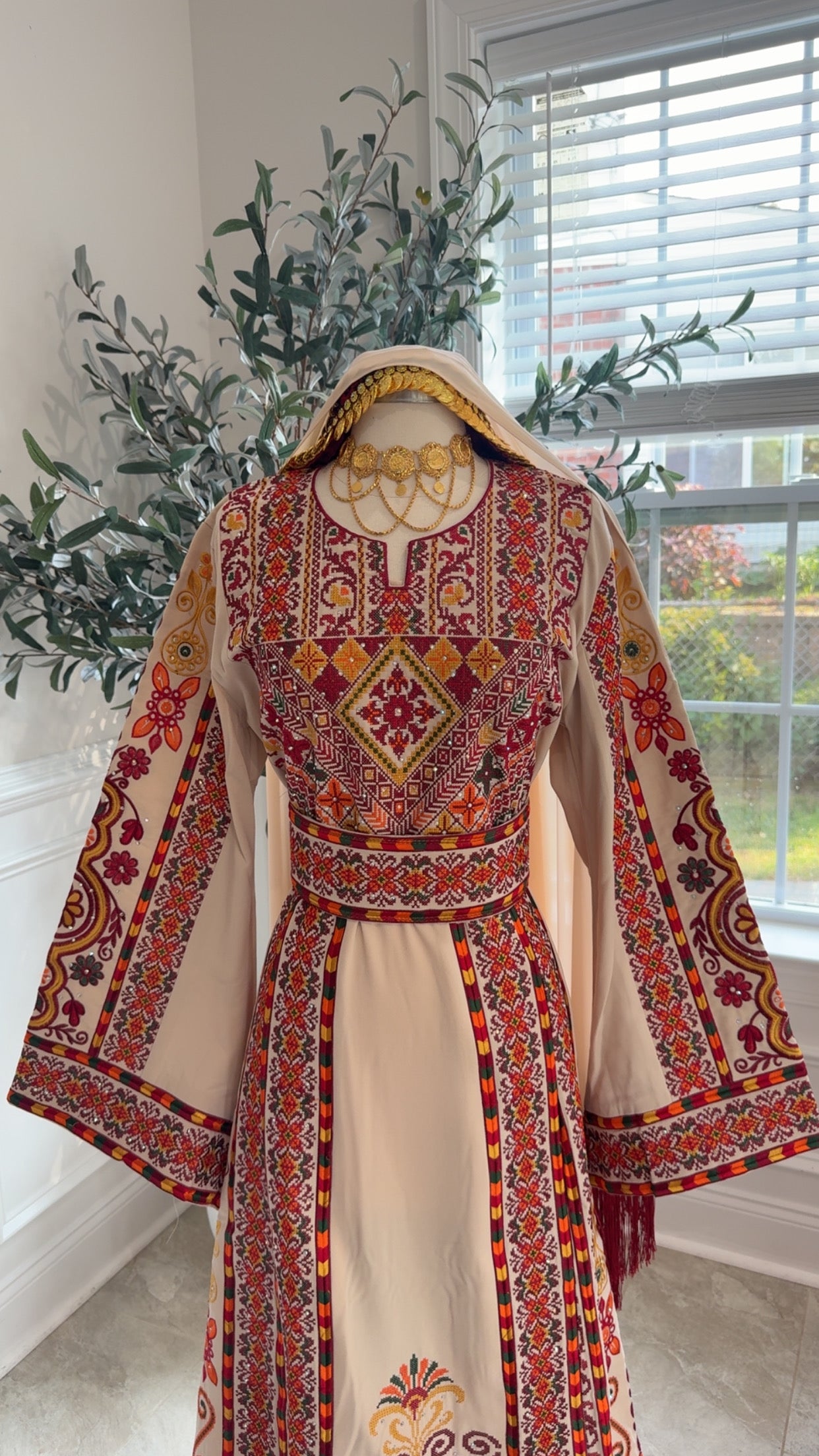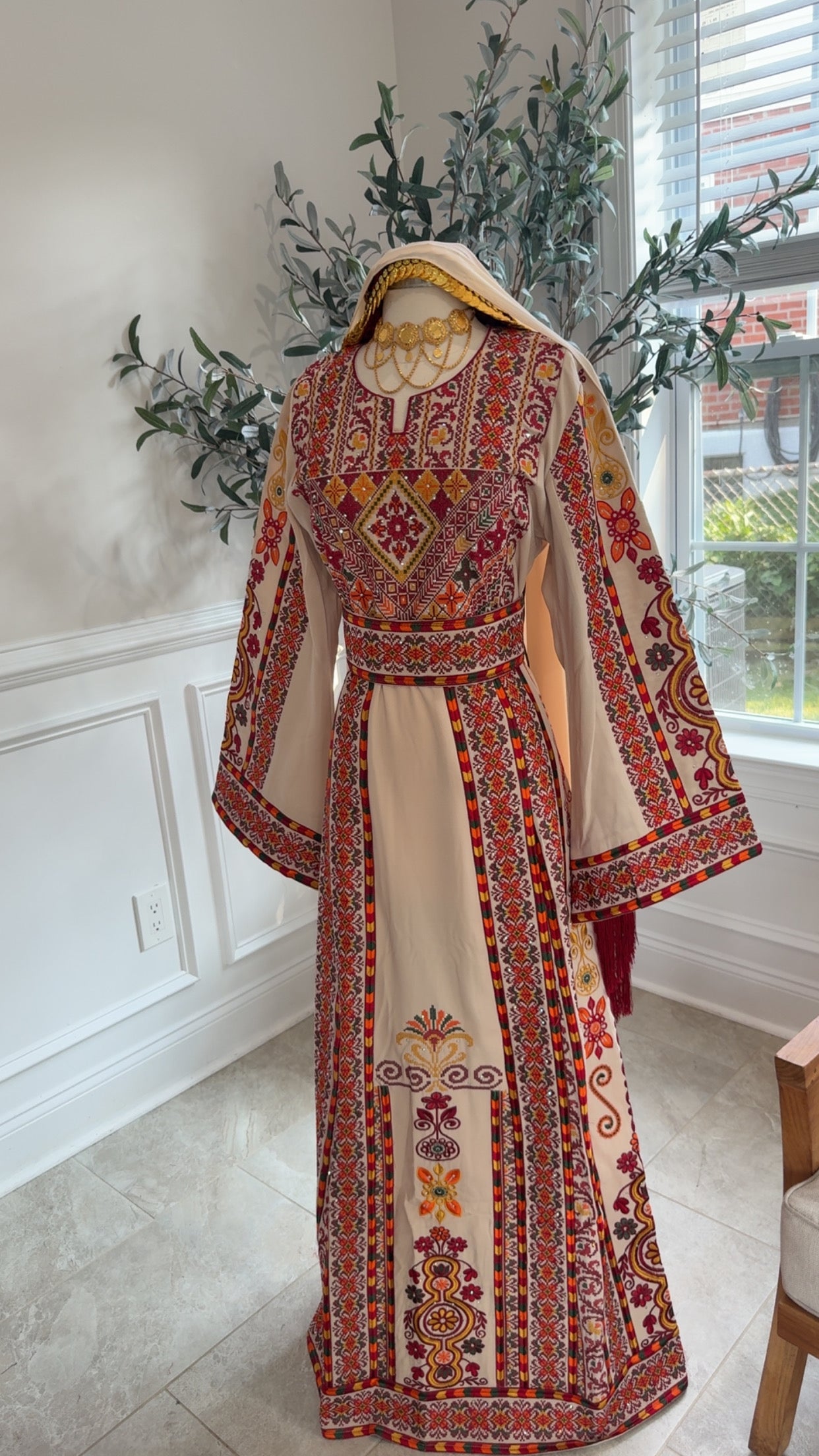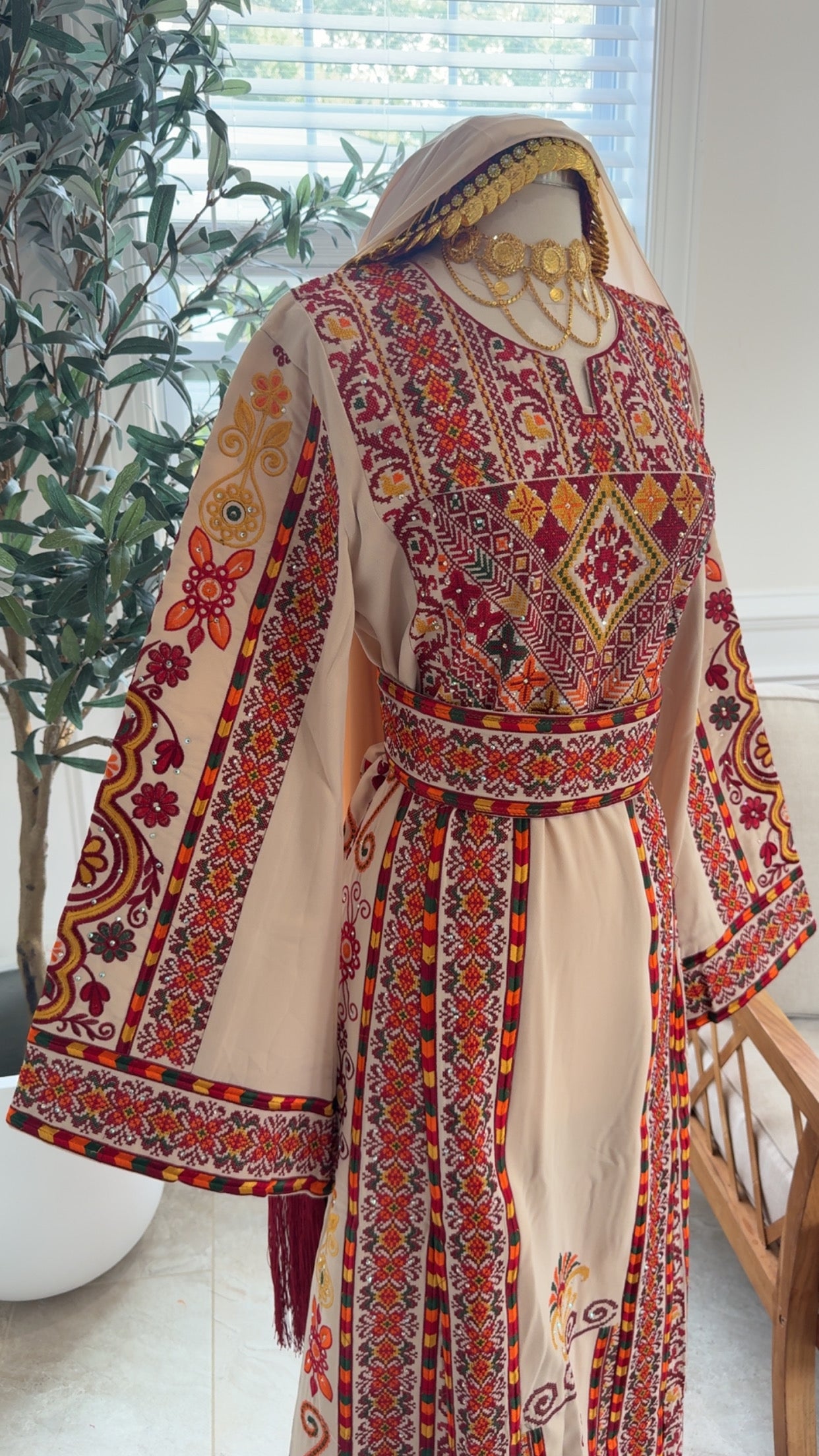 Our Newest Heavily embroidered Beige Malika Thobe with Malika design embroidery