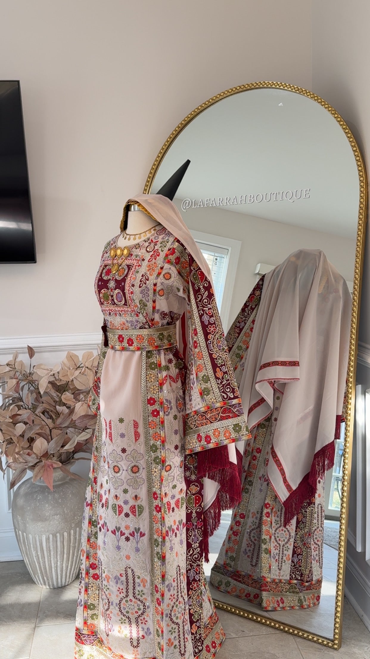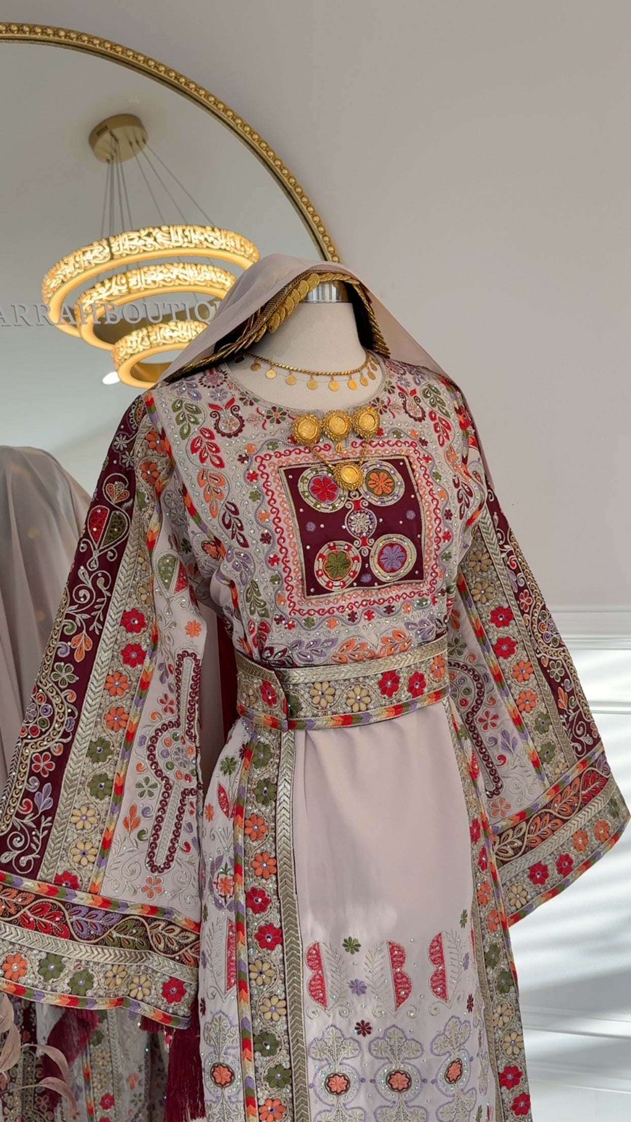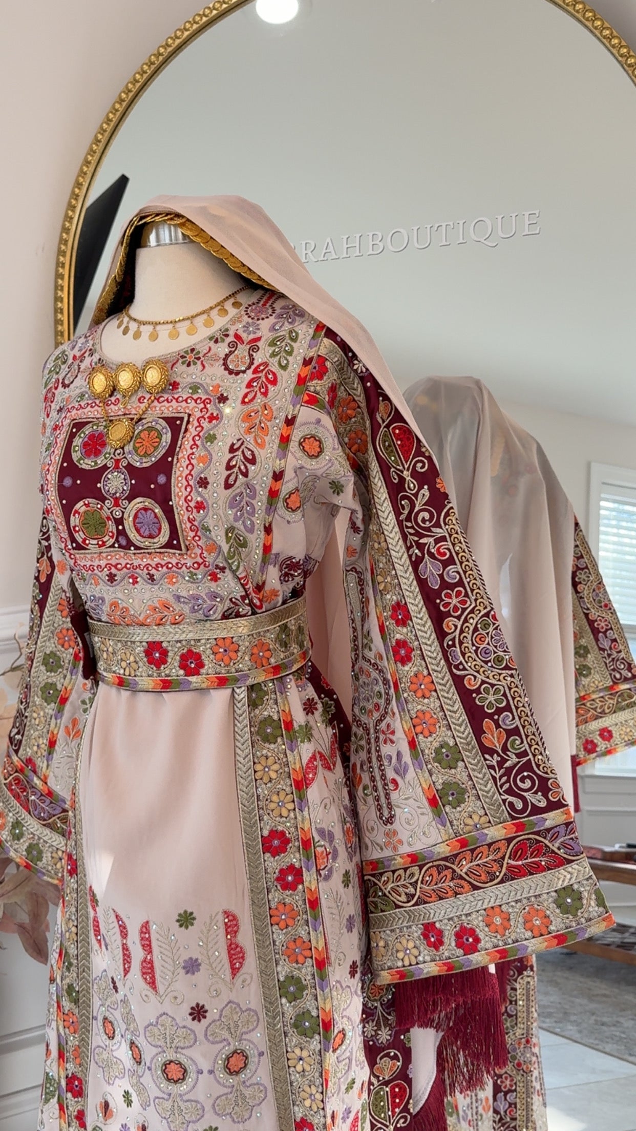 Our Newest Heavily embroidered Beige Malika Thobe with Malika design & Kasab embroidery