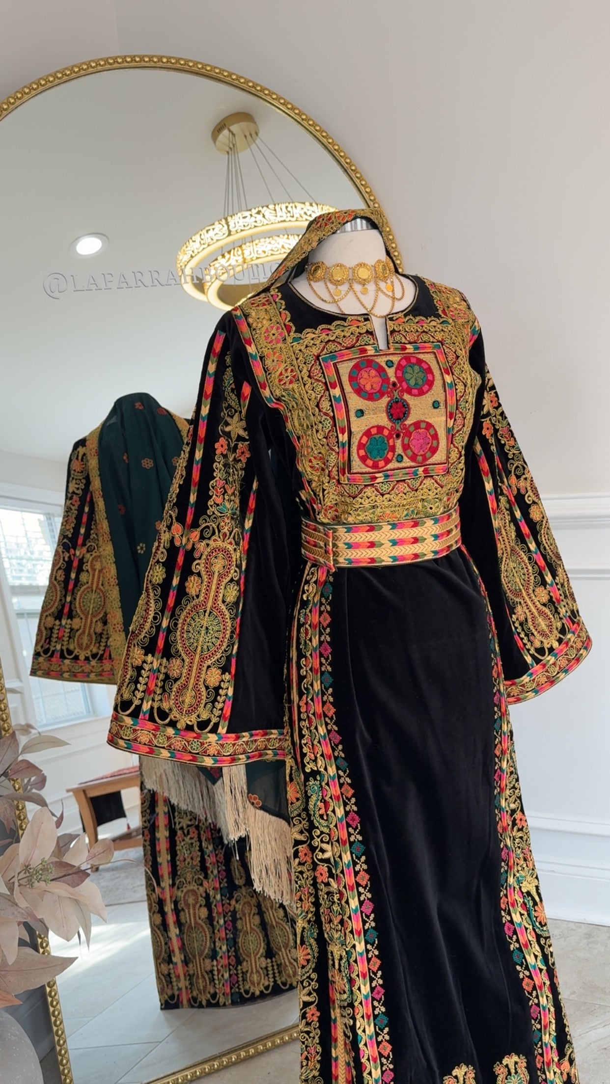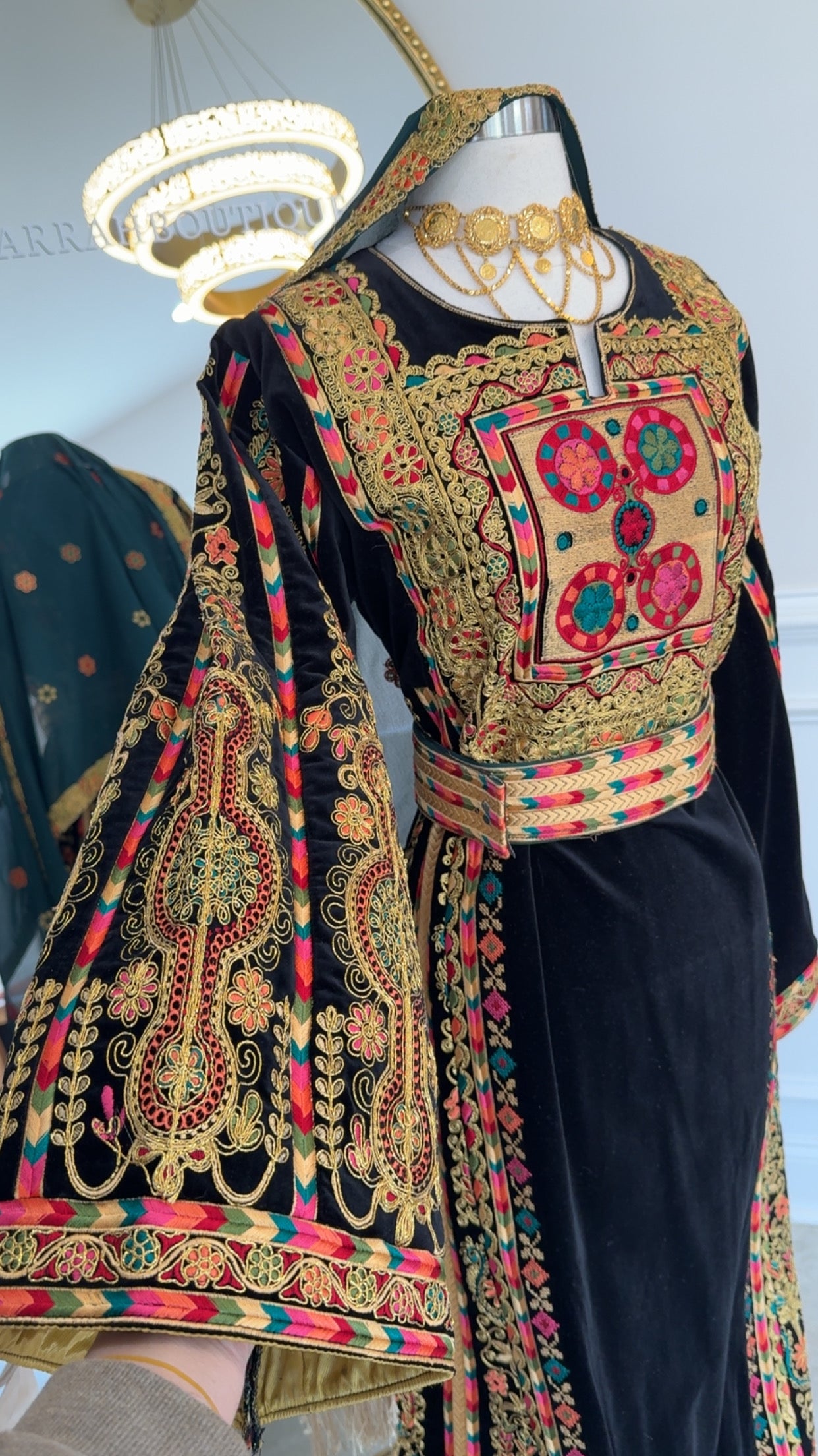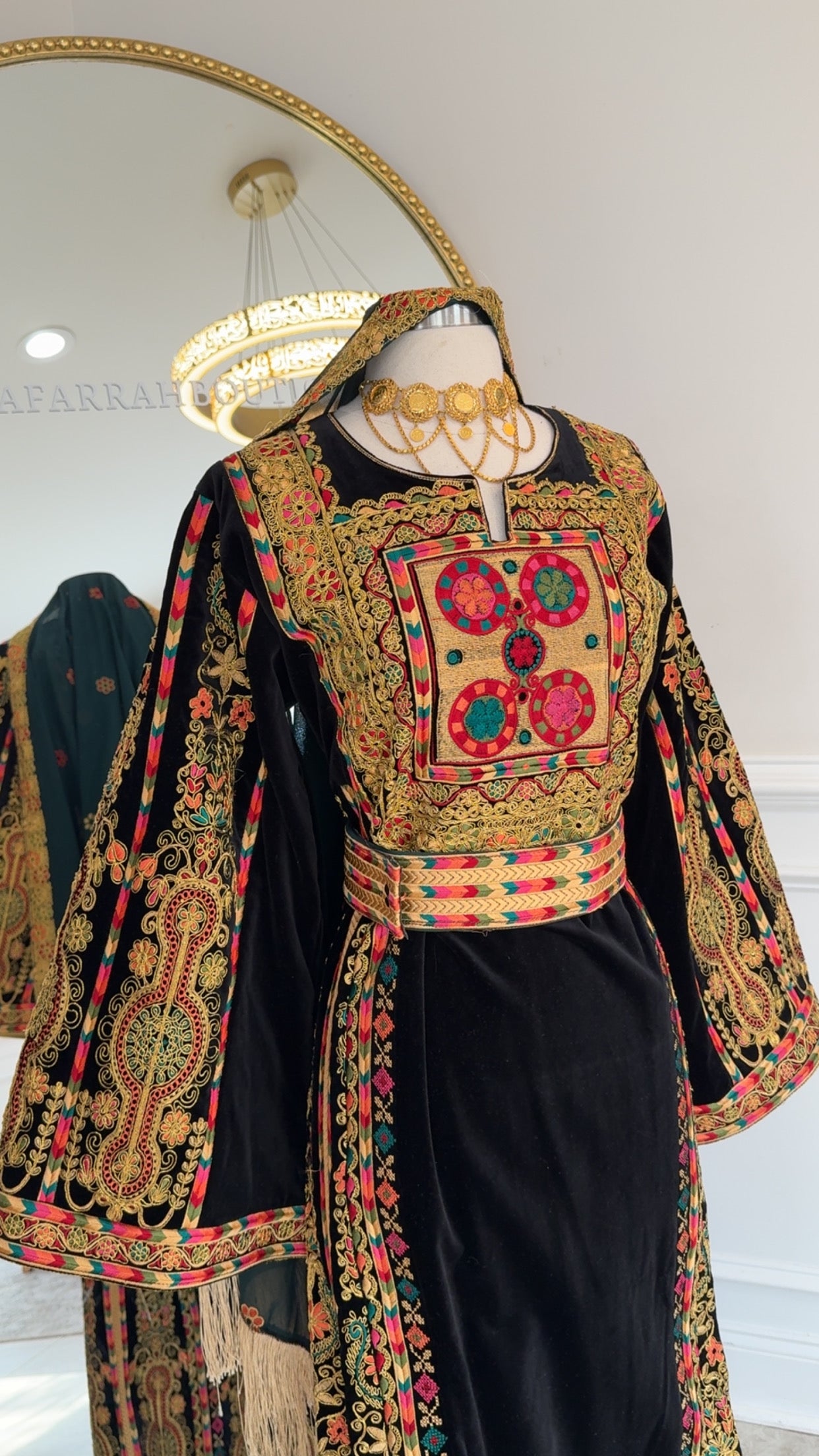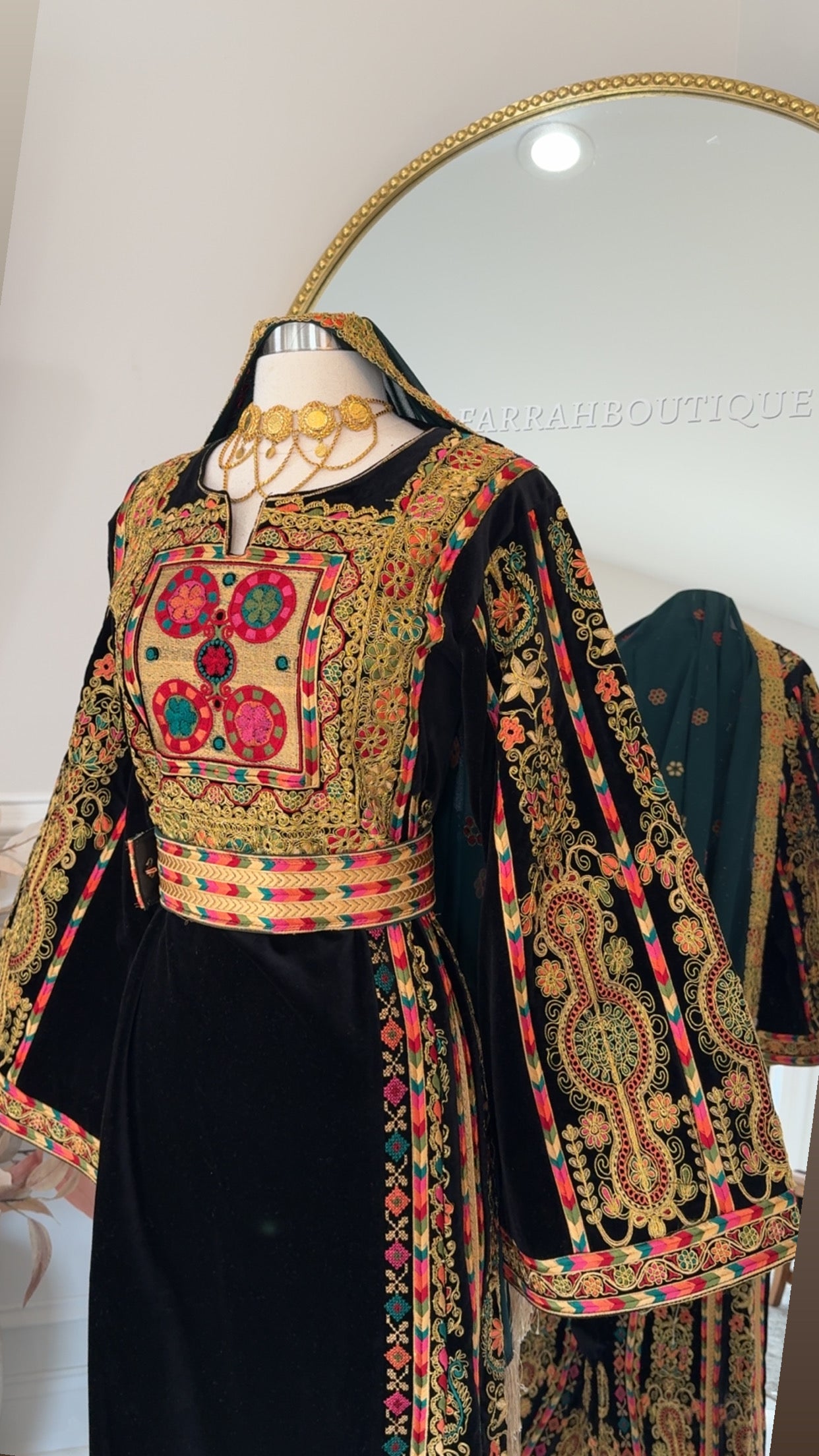 Newest Black Velvet Material Thobe Malika vintage inspired Embroidery design with gold Kasab embroidery