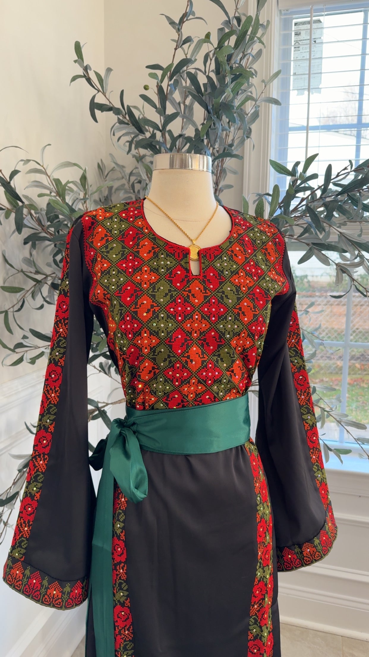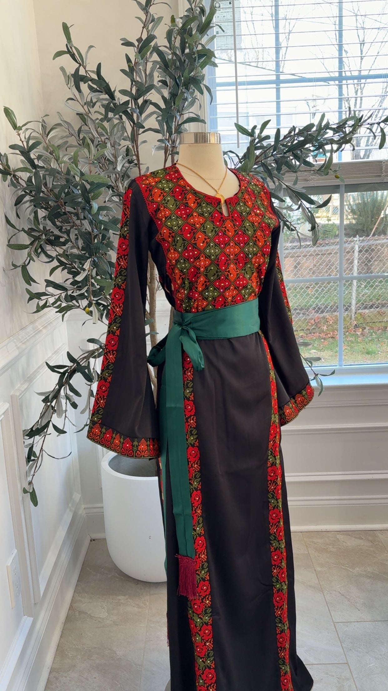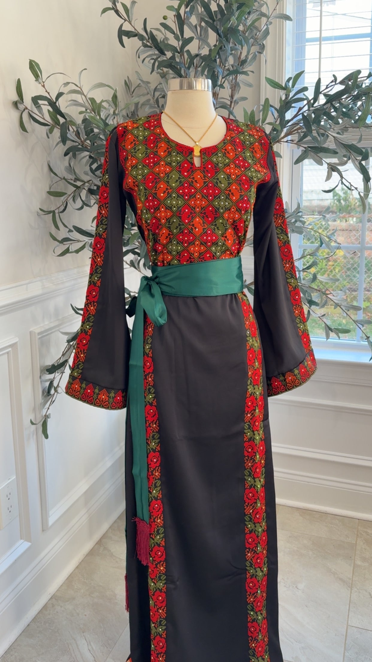 our Newest Floral + Manajel embroidered Tatreez Dresses made with 4 Manajel (٤ عروق) on each side.