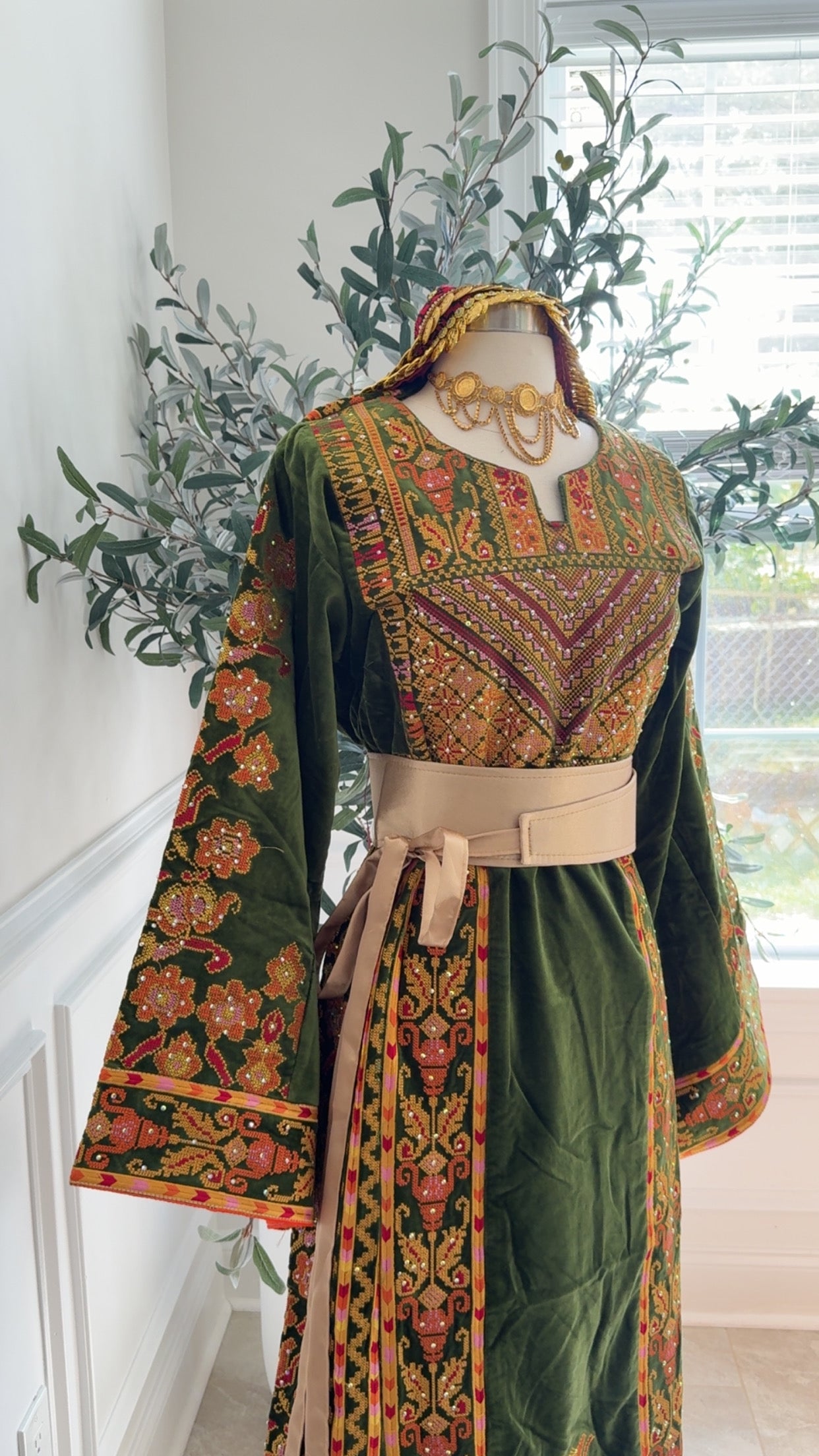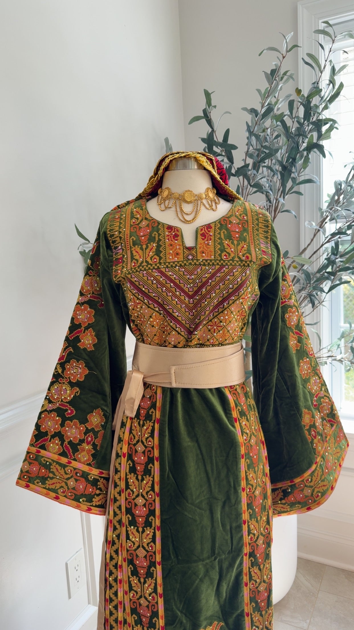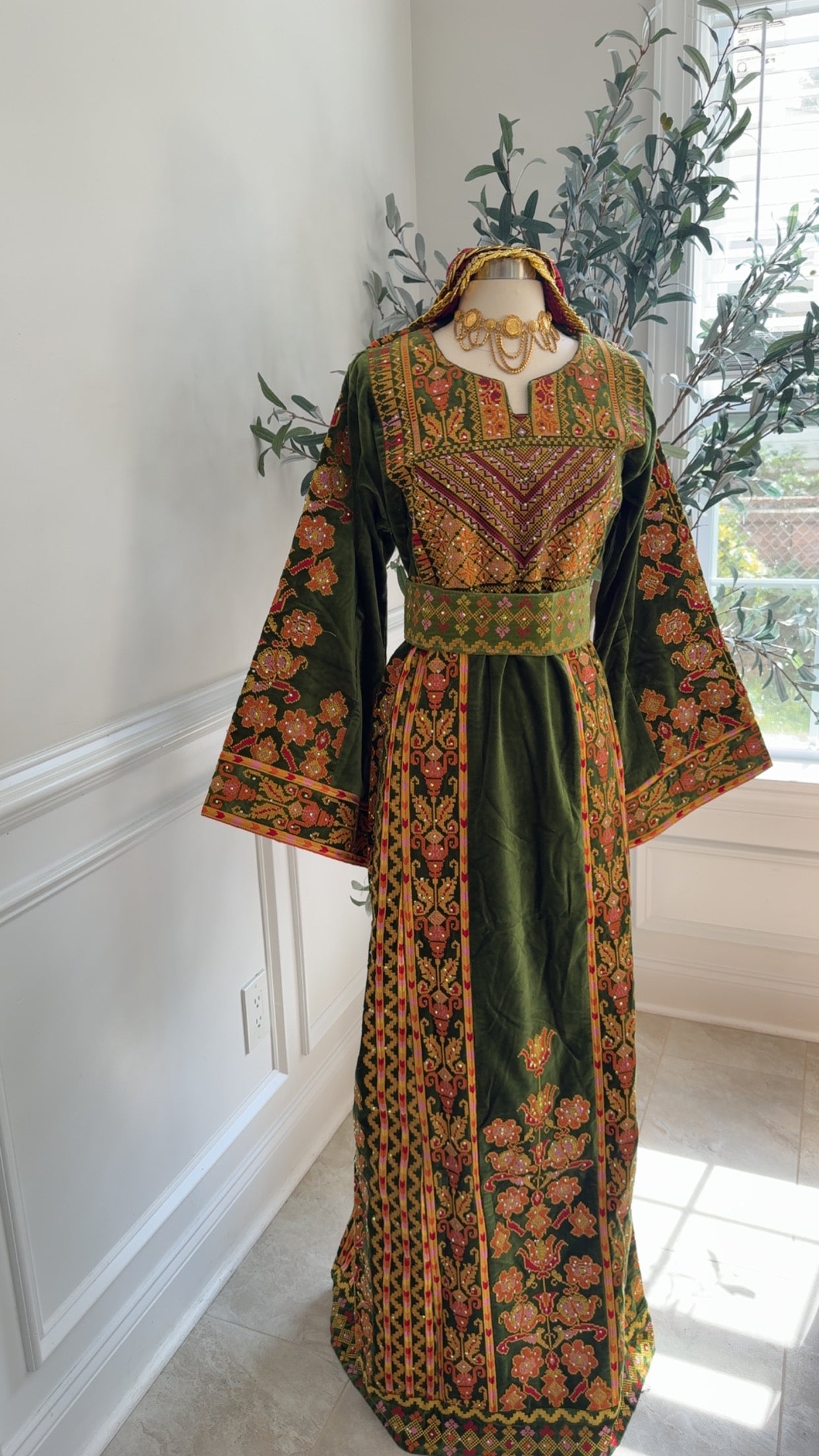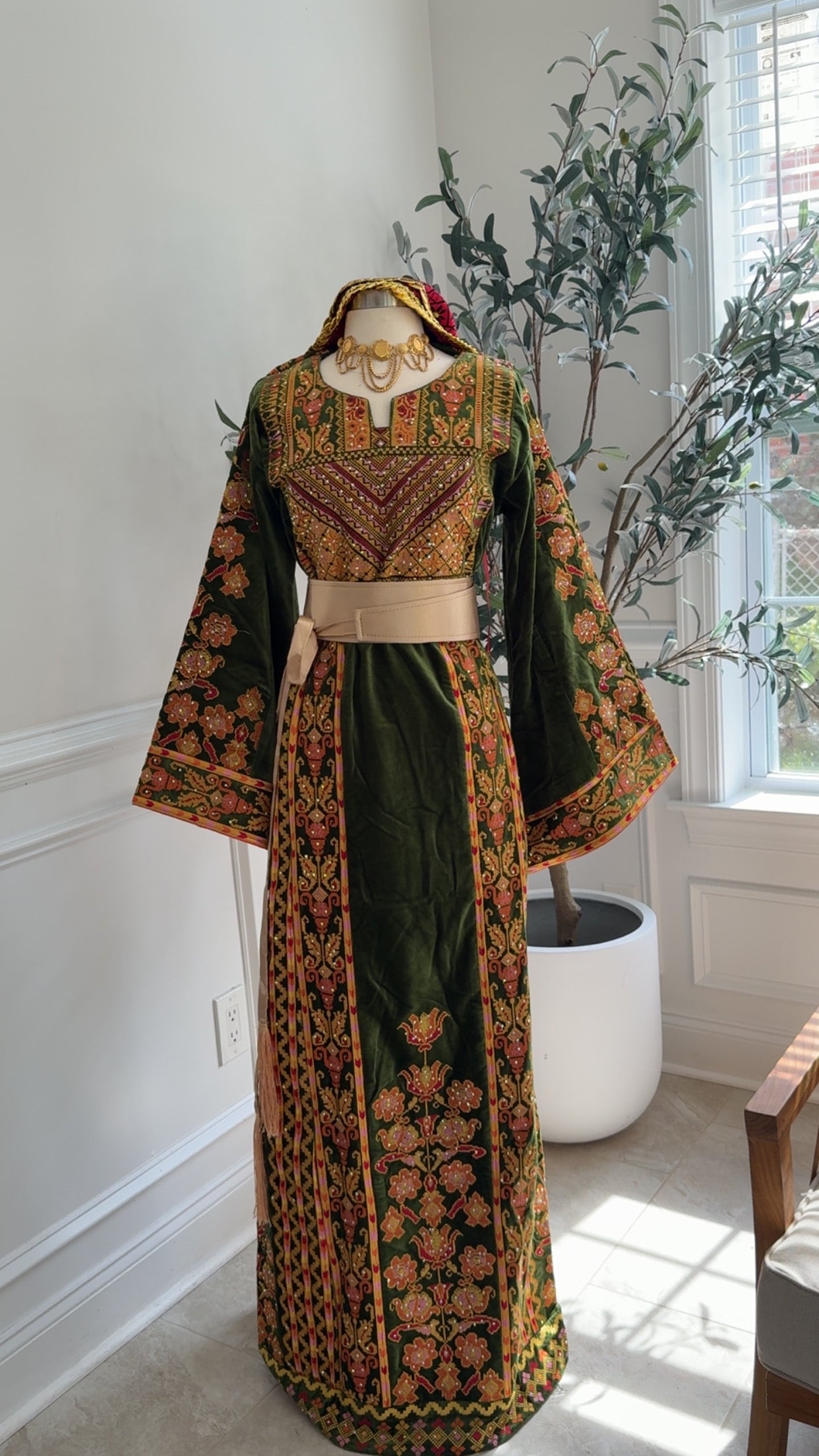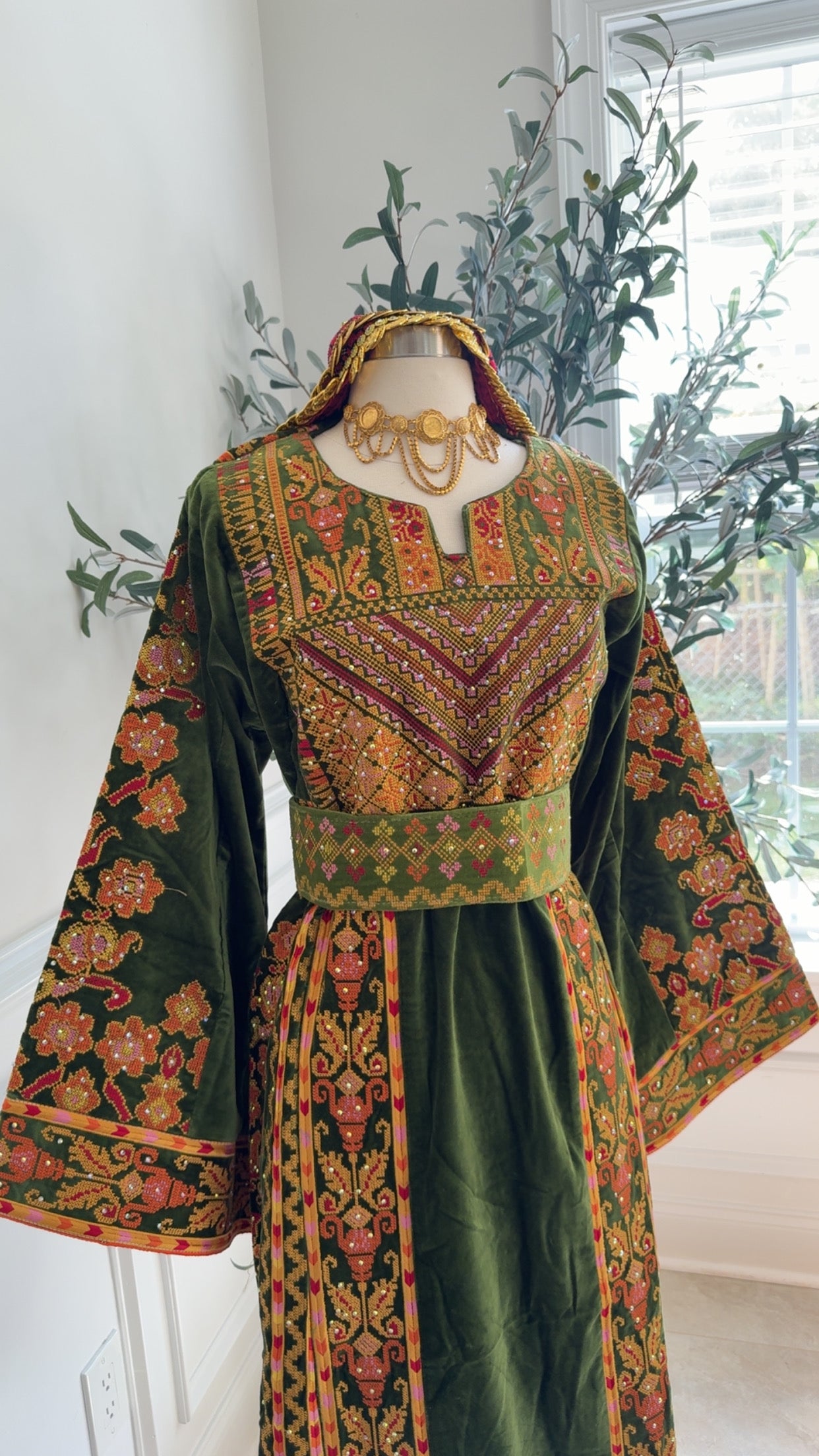 Our Newest Heavily embroidered Floral Atameen Thobe Made on Velvet Lime Green color material
