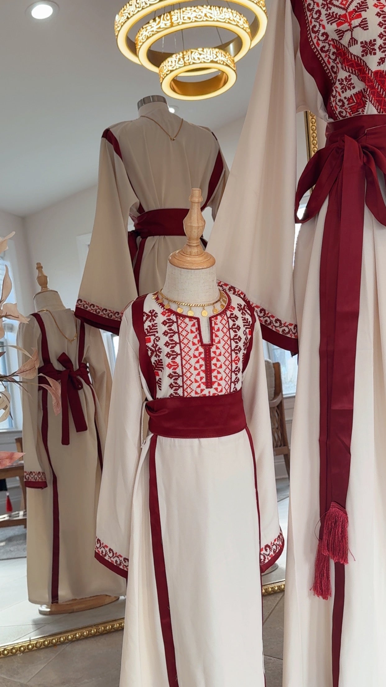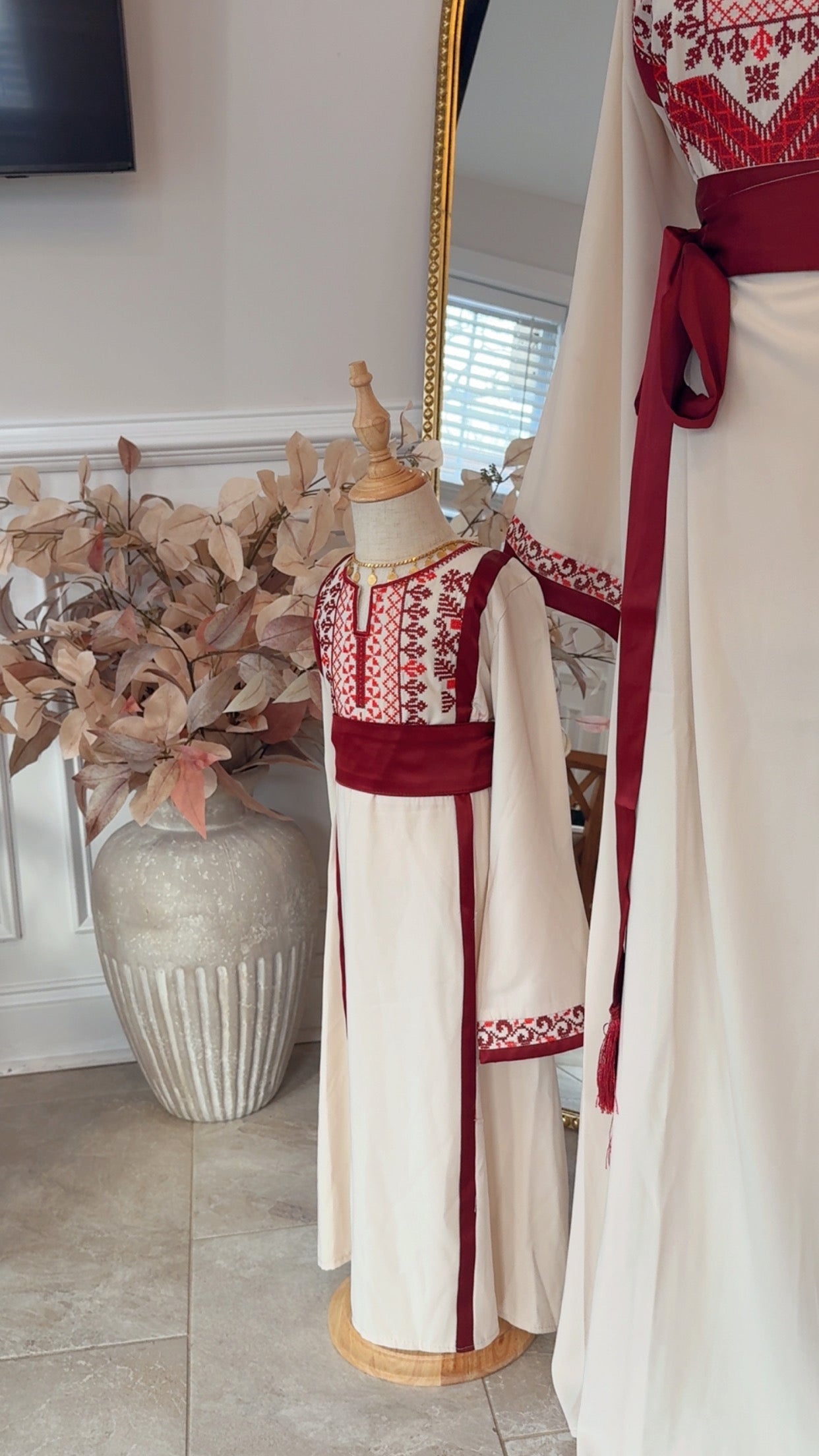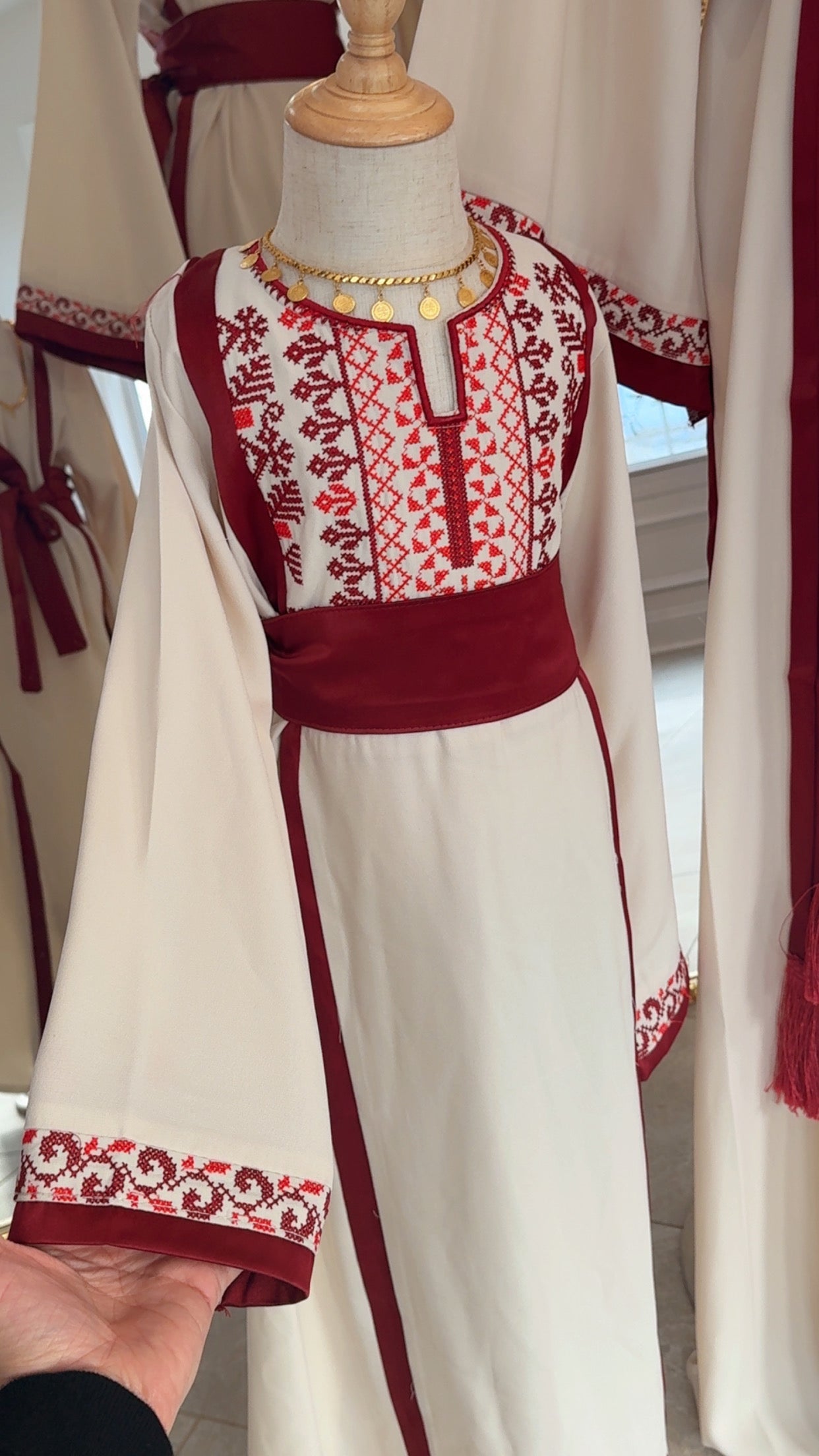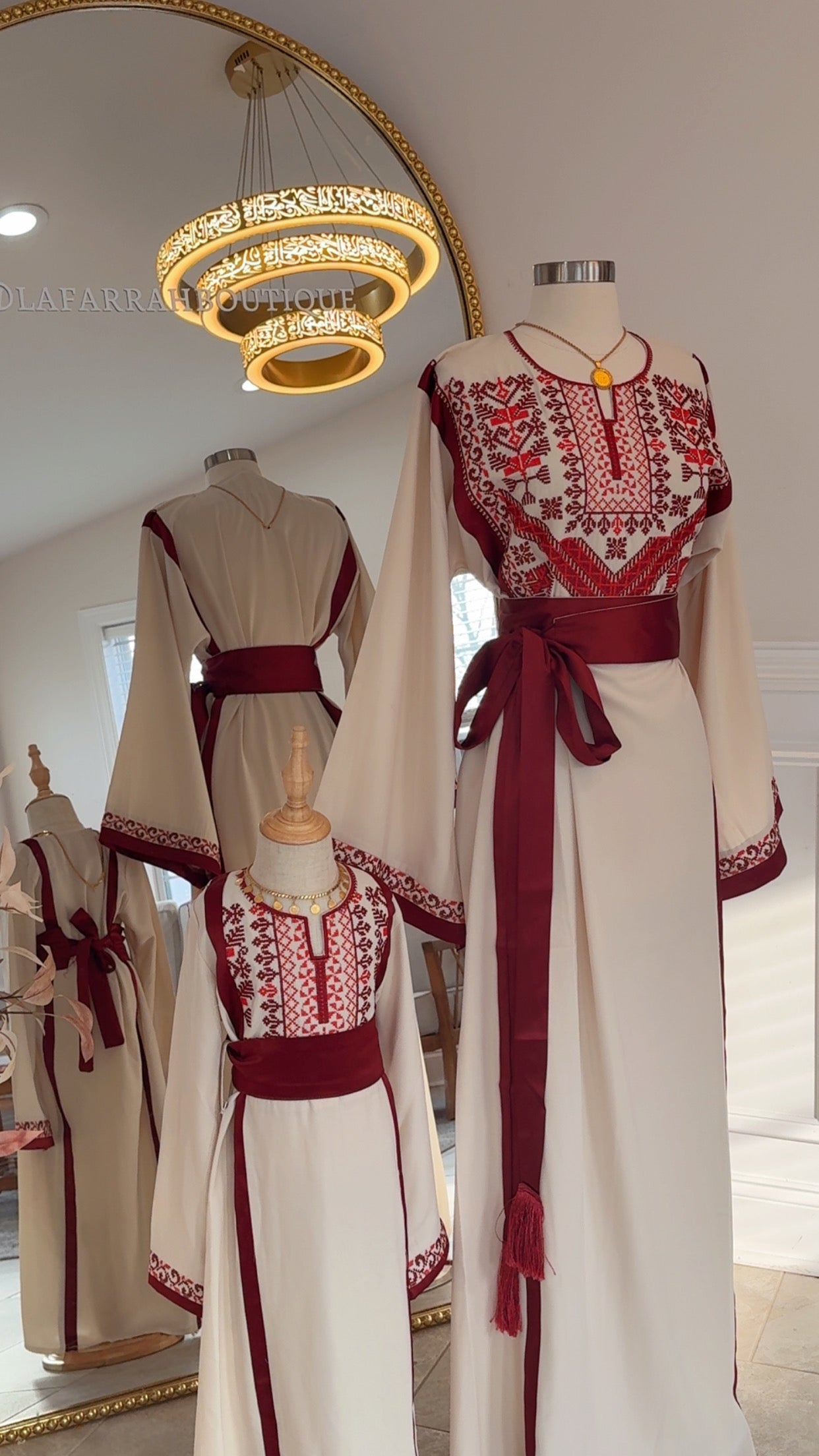 Introducing our Ramadan Collection with a New Simple Tatreez Beige Dress with Maroon & Red embroidery.