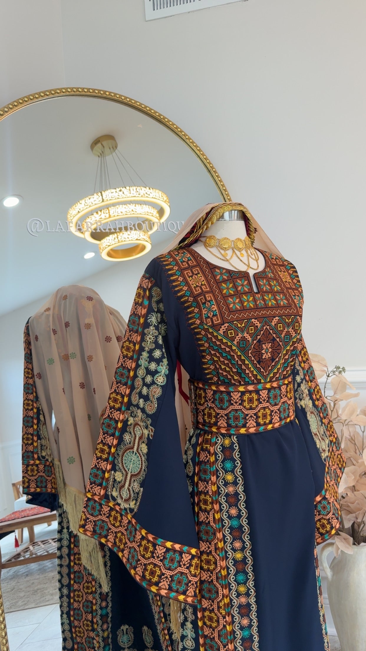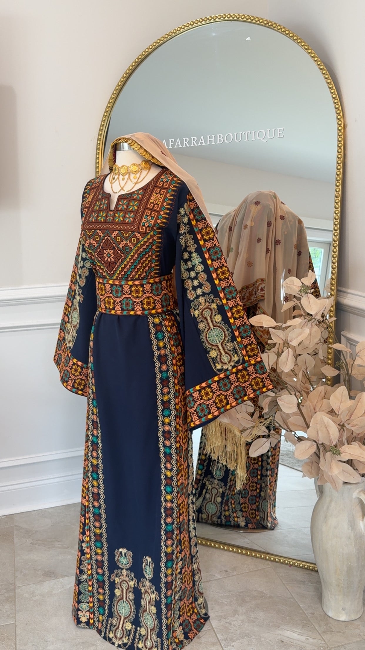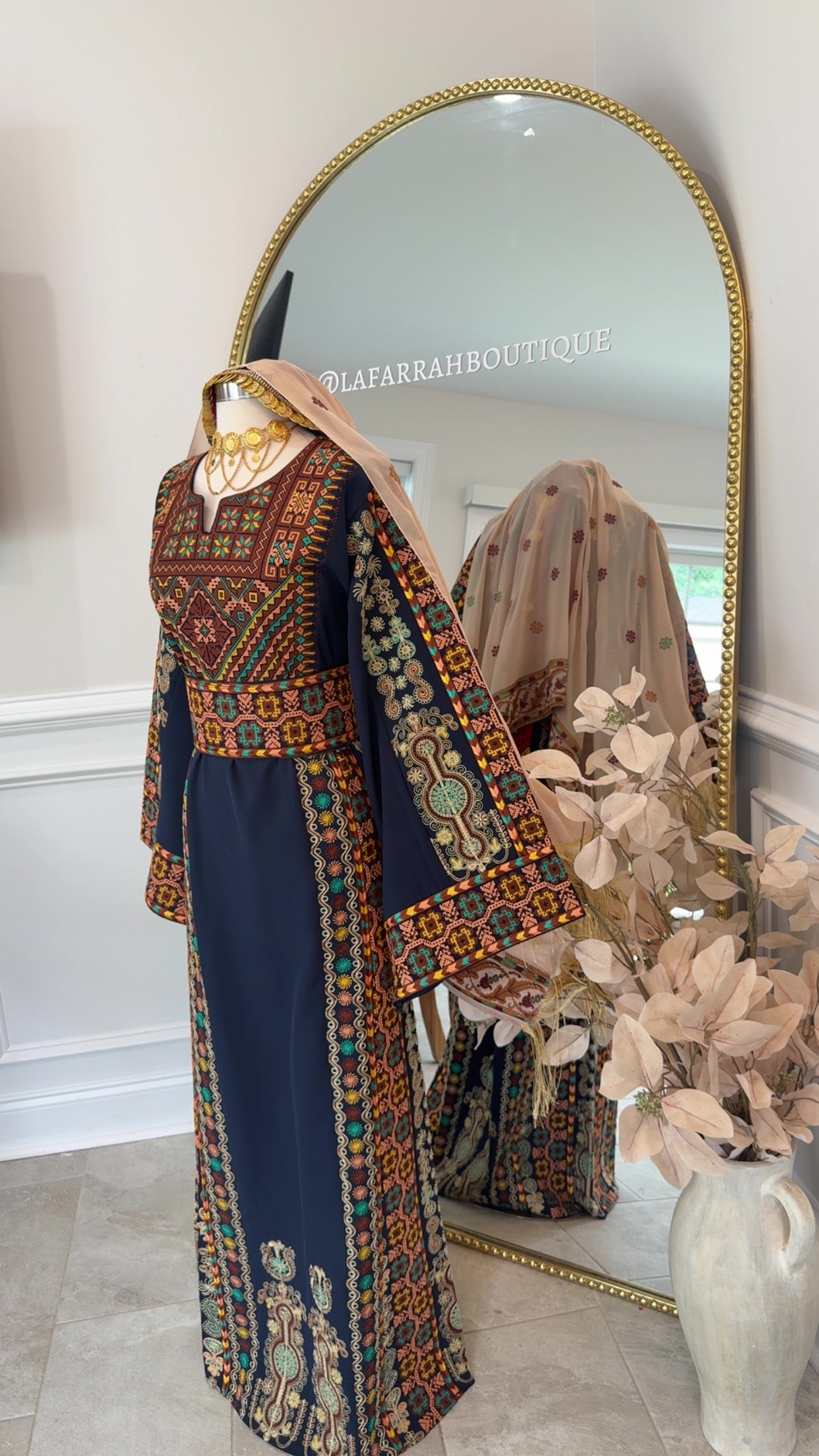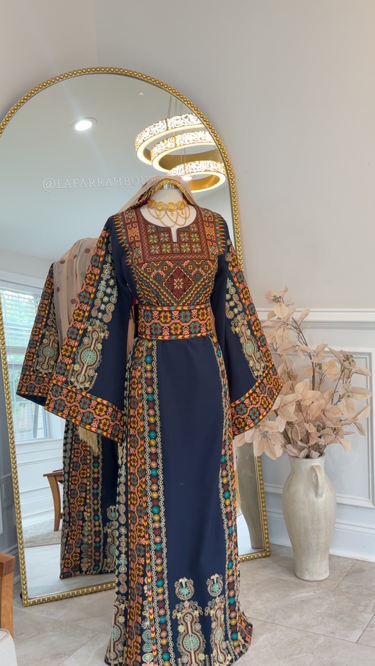 Beautiful New Navy Malika embroidery design Thobe made with heavily Kasab Embroidery on Navy Blue color material