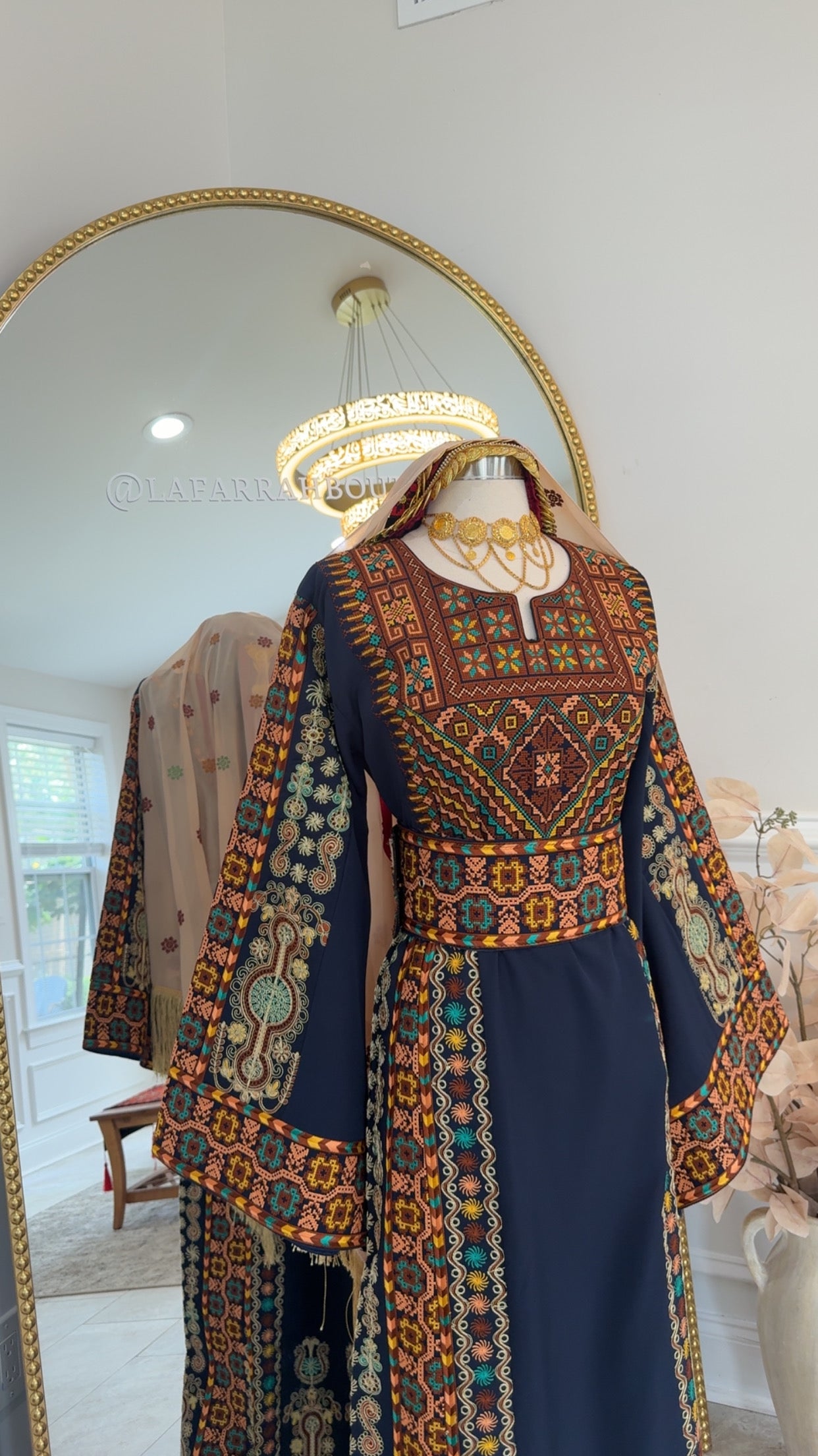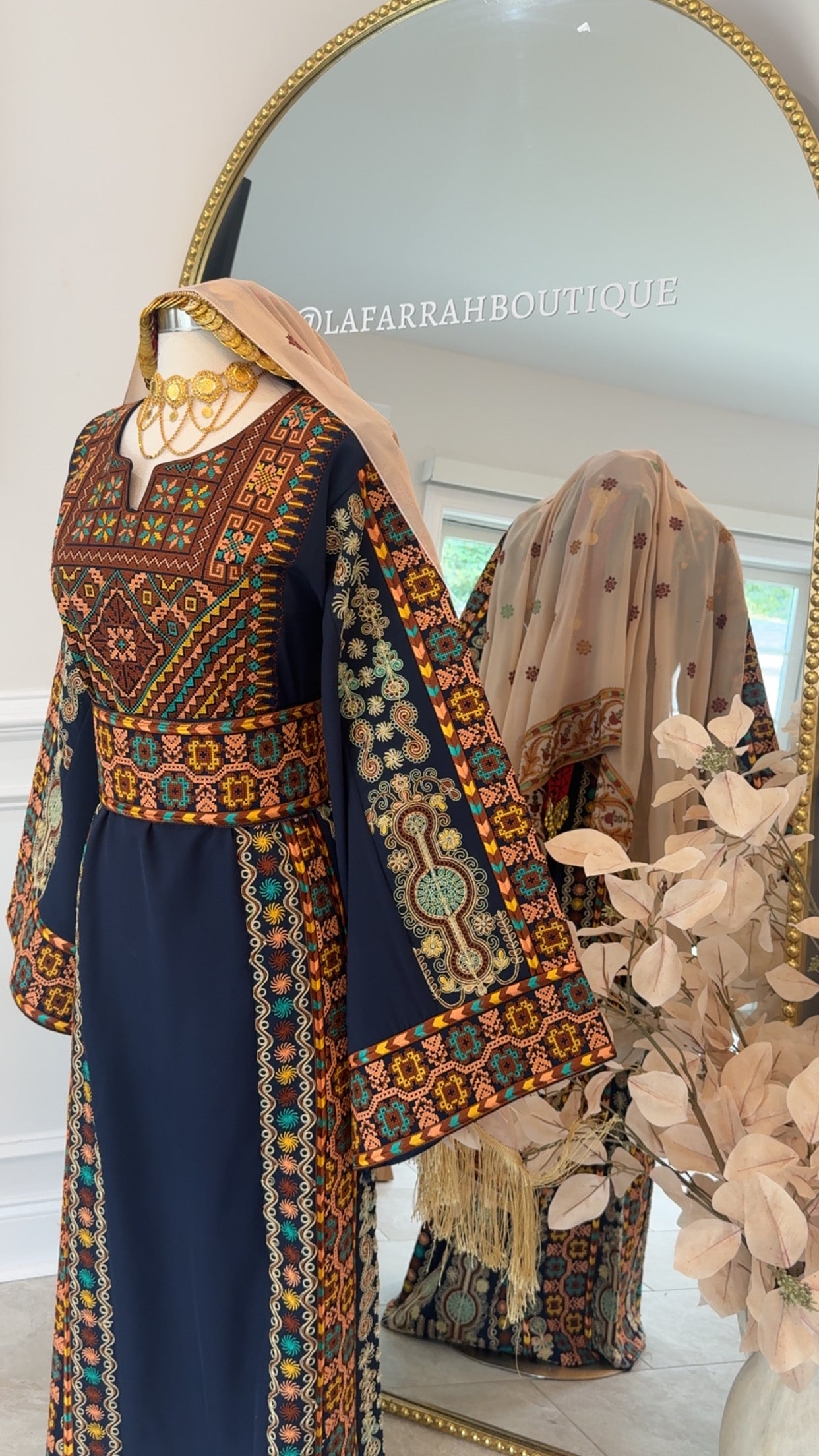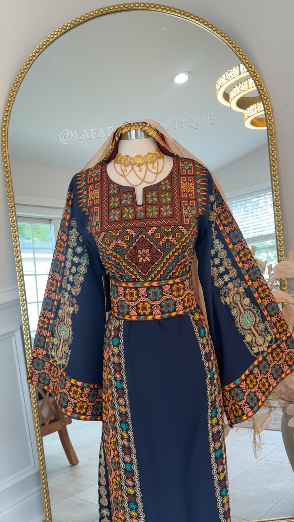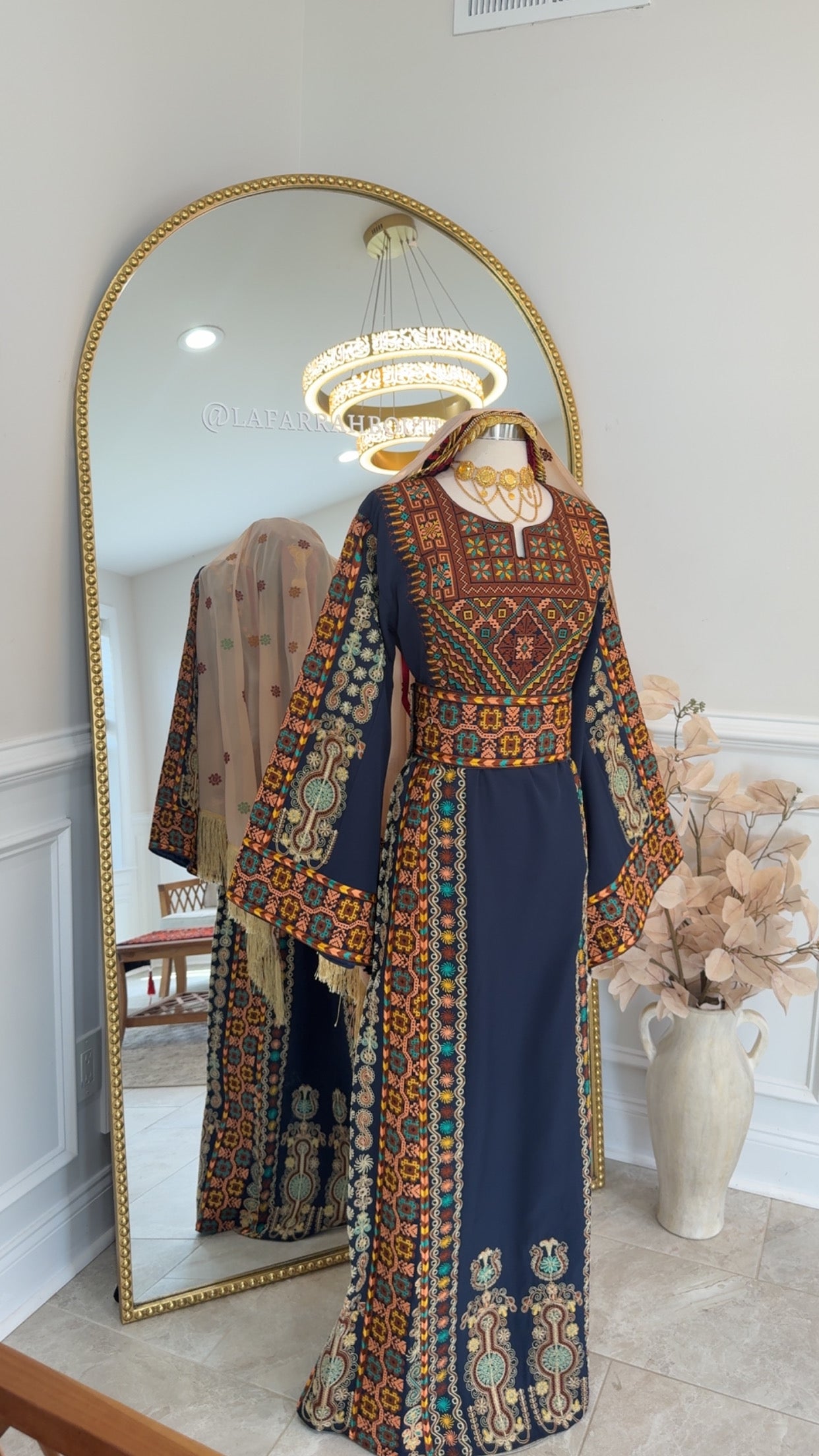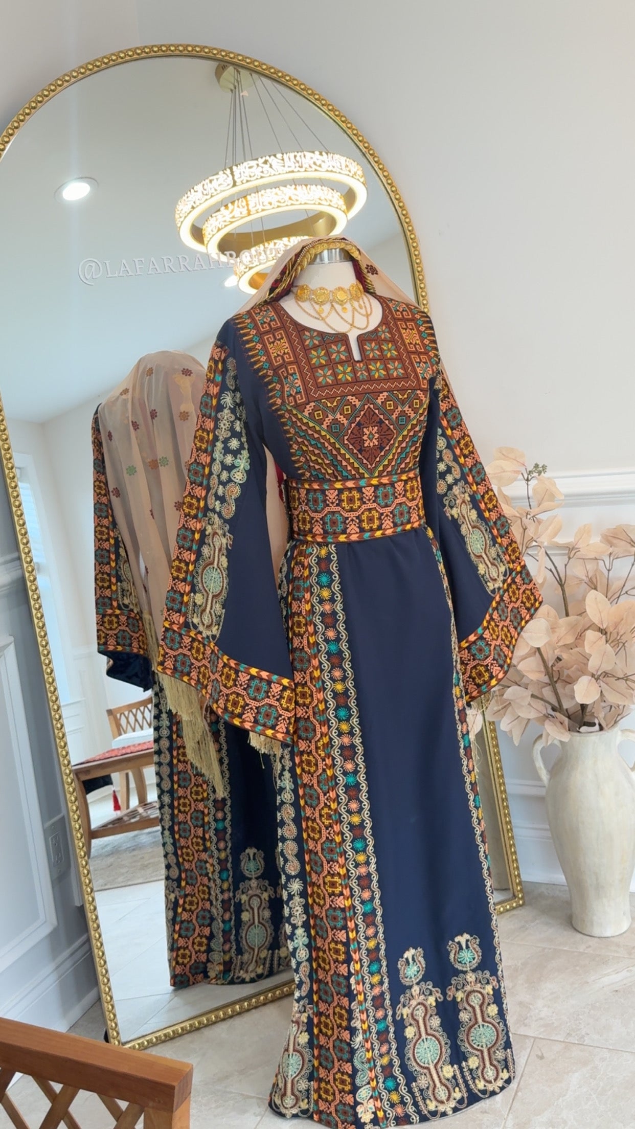 Beautiful New Navy Malika embroidery design Thobe made with heavily Kasab Embroidery on Navy Blue color material