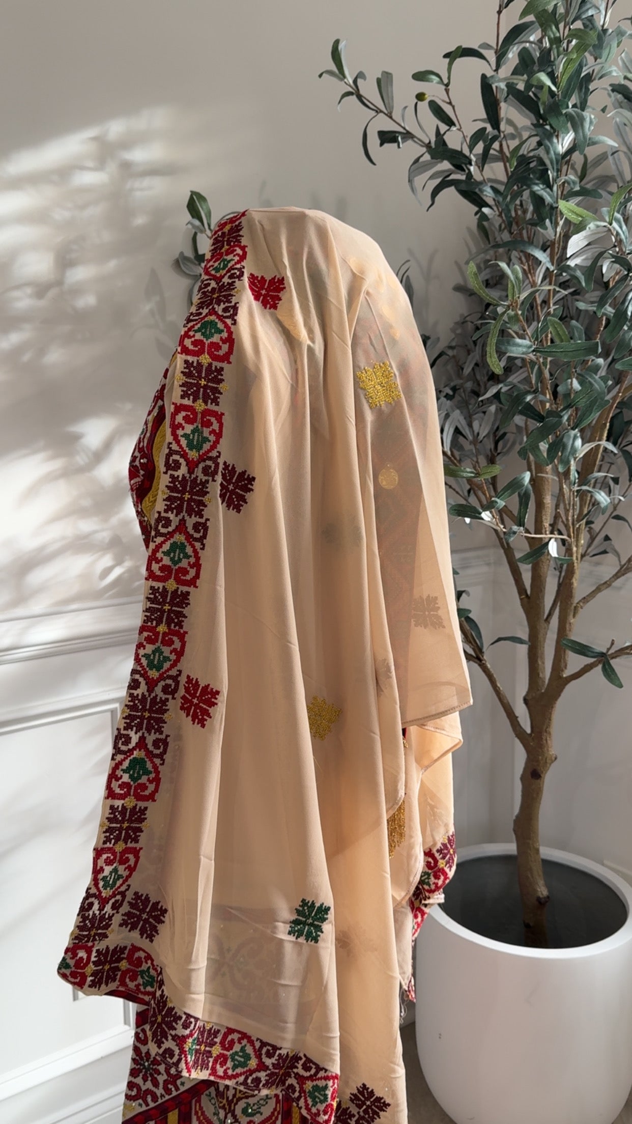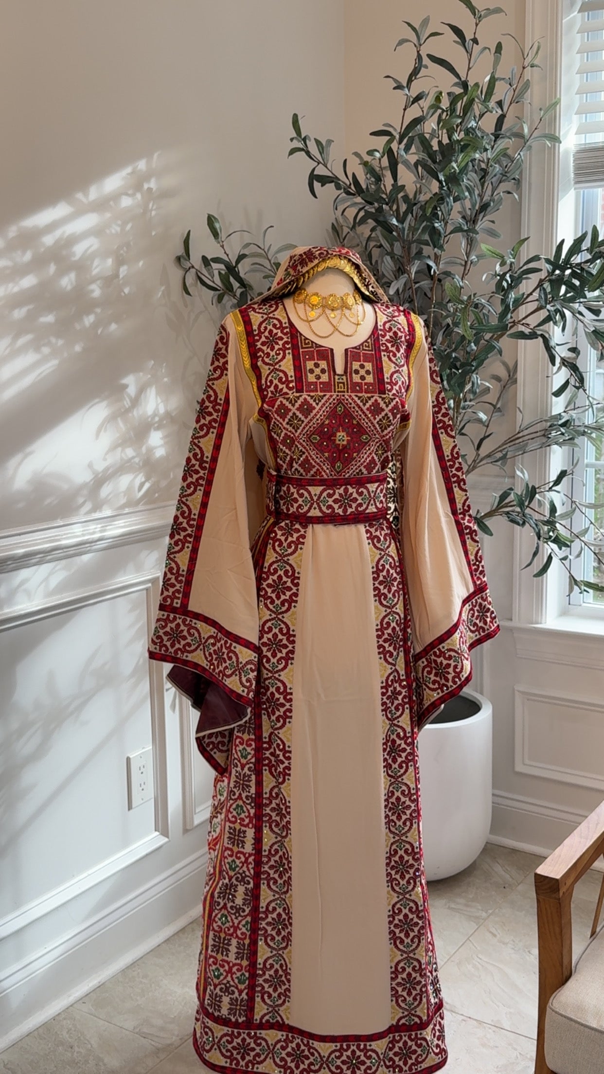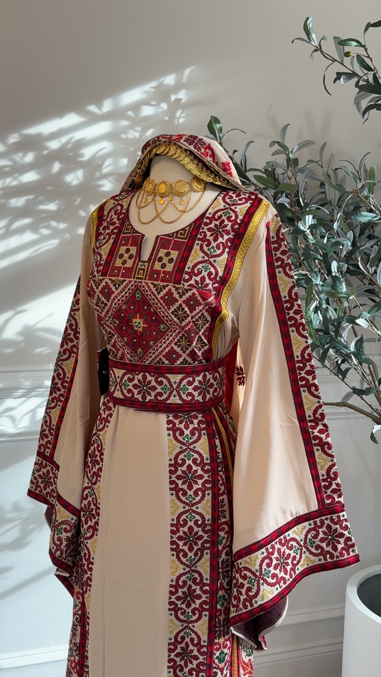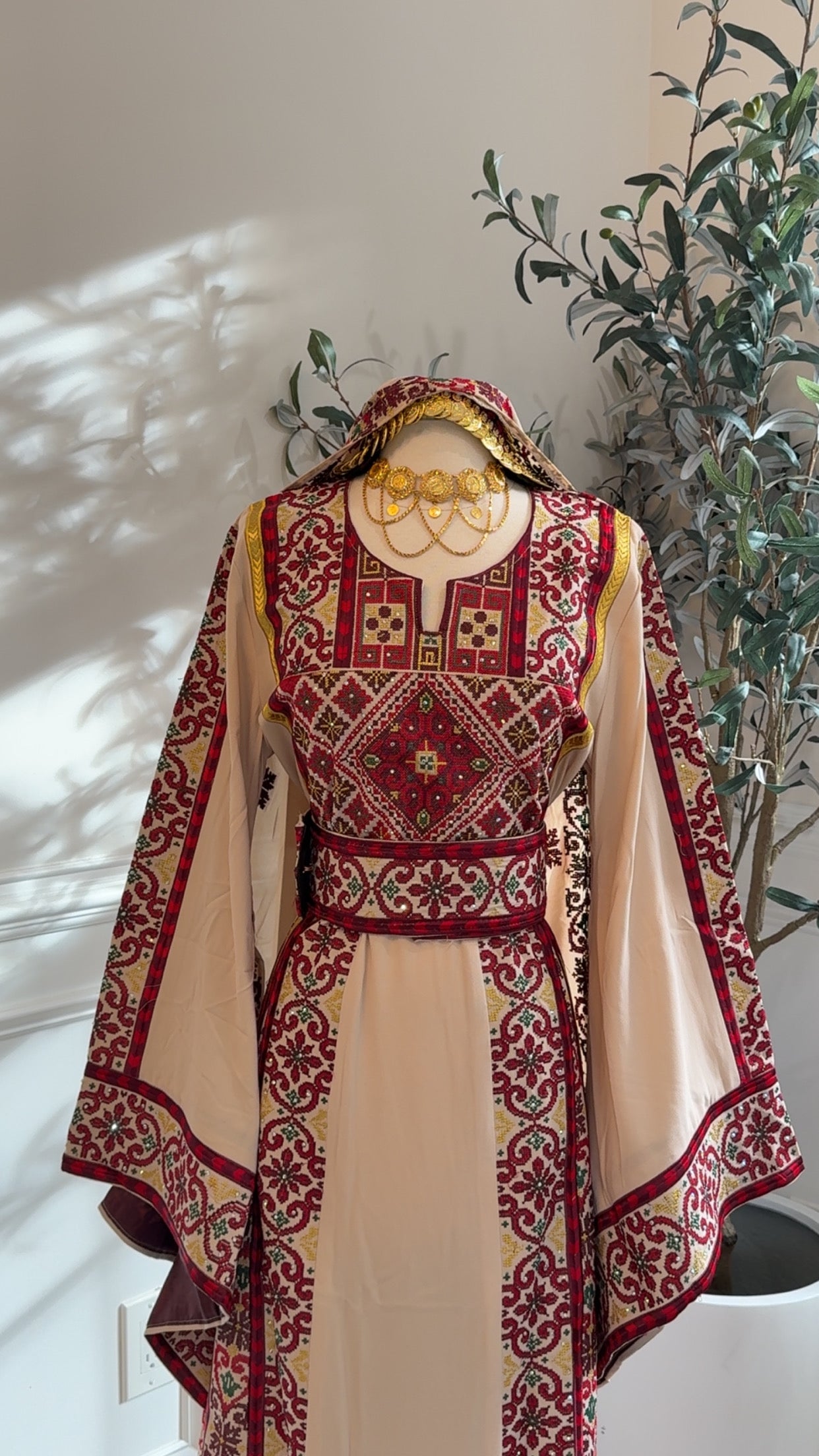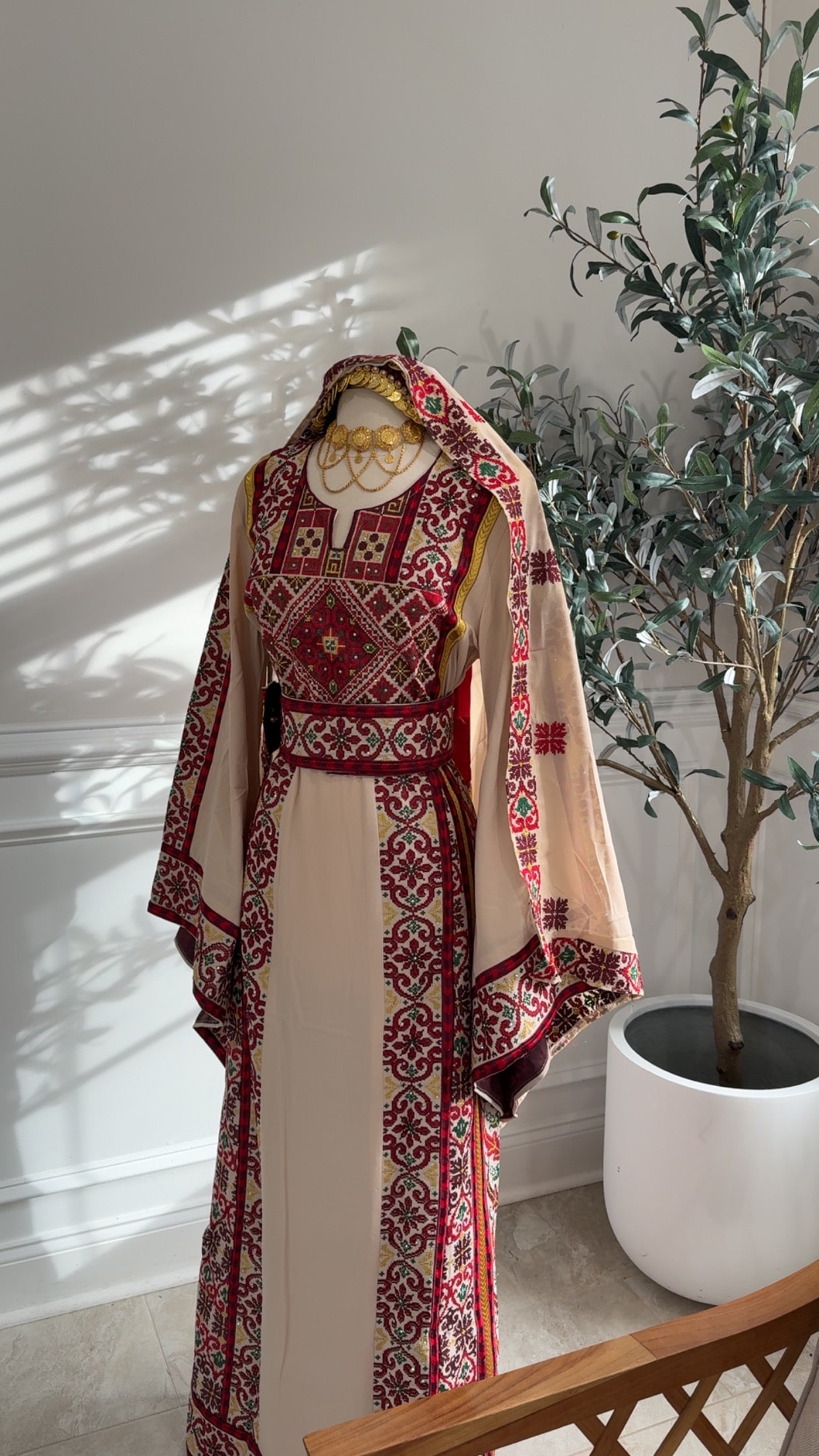 Beautiful New red embroidered Thobe on beige color material with draping sleeves
