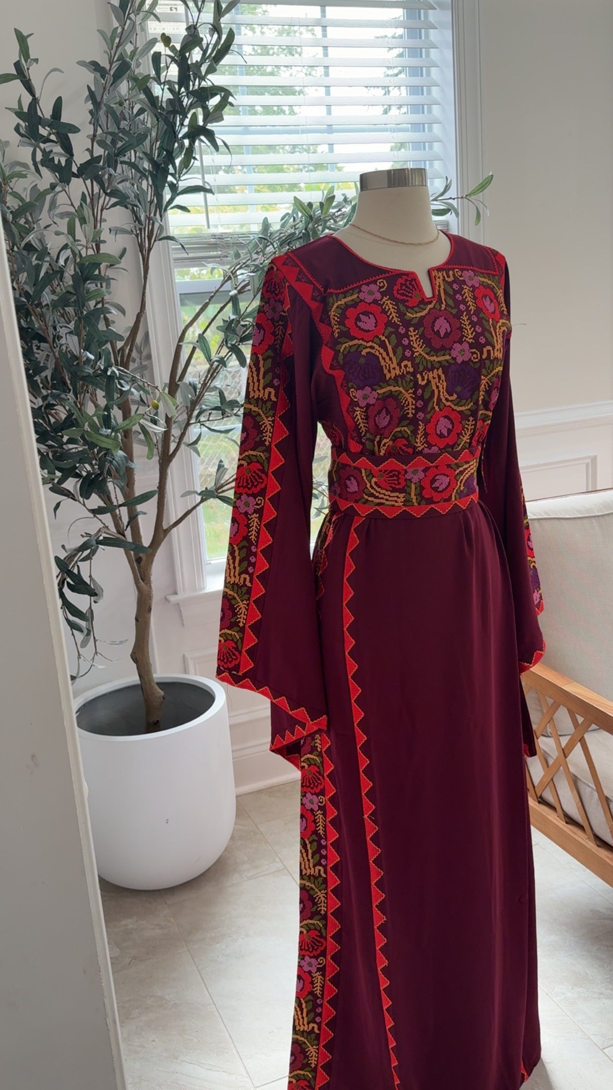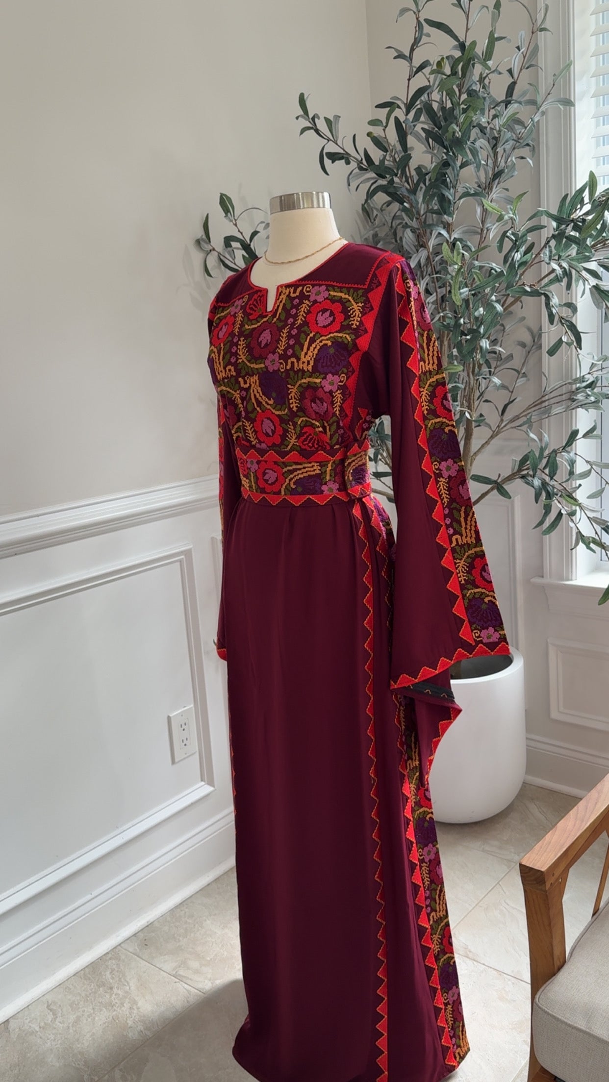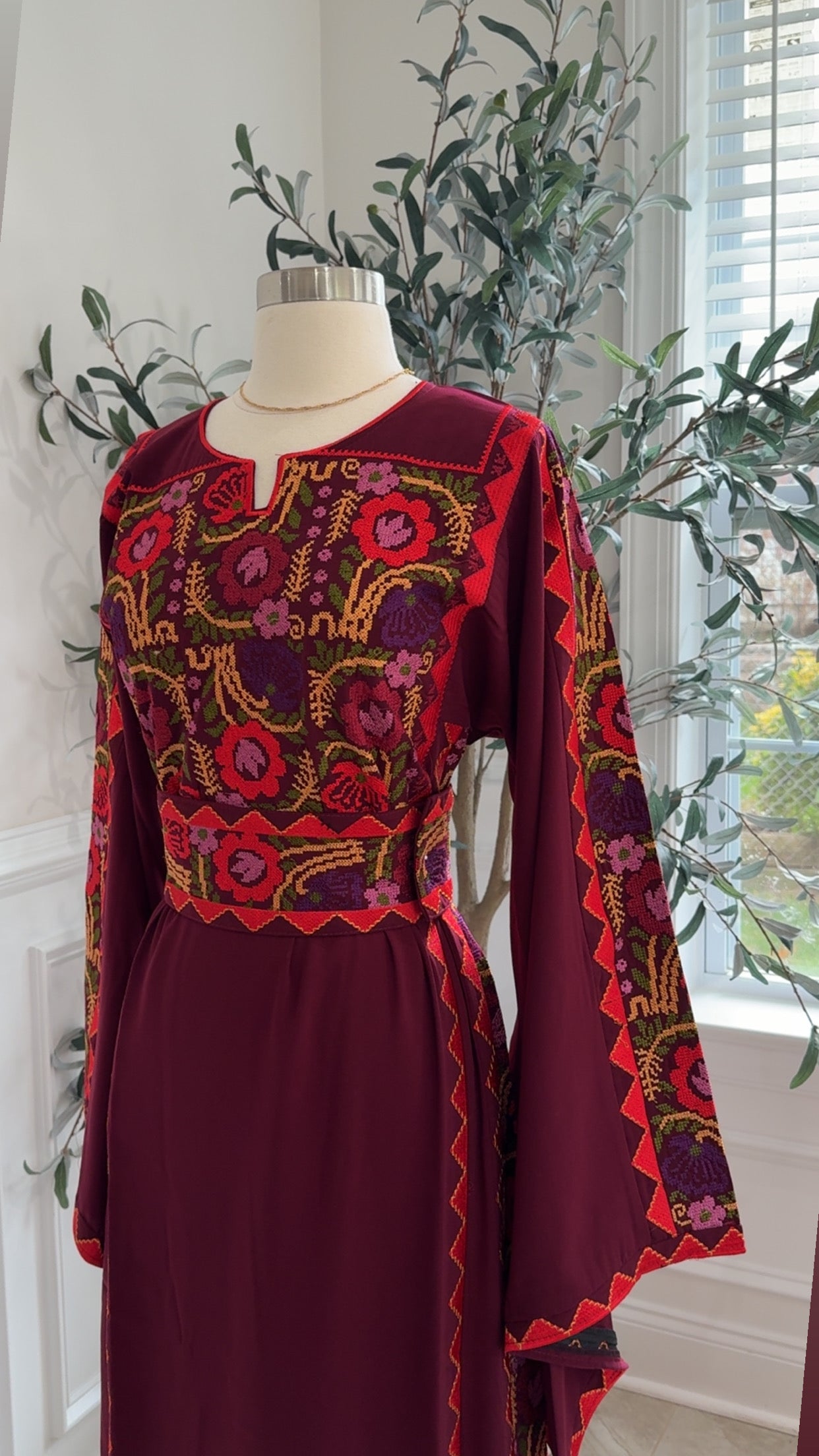 New maroon color material with Floral embroidery design dress with long draping sleeves